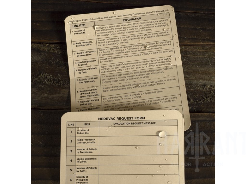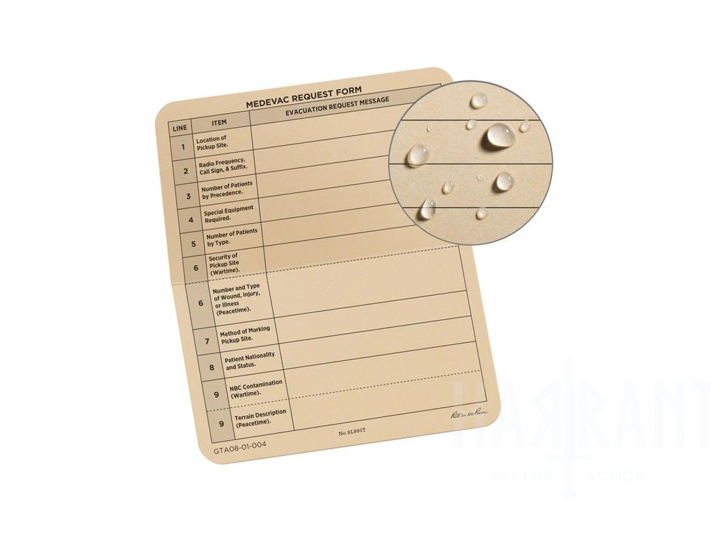 Tyto originální MEDEVAC karty Rite in the Rain jsou vyrobeny z odolného all-weather papíru, který spolehlivě funguje i v dešti, blátě nebo prachu. Přední strana obsahuje formulář 9-Line MEDEVAC, zadní strana pak vysvětlivky jednotlivých bodů.