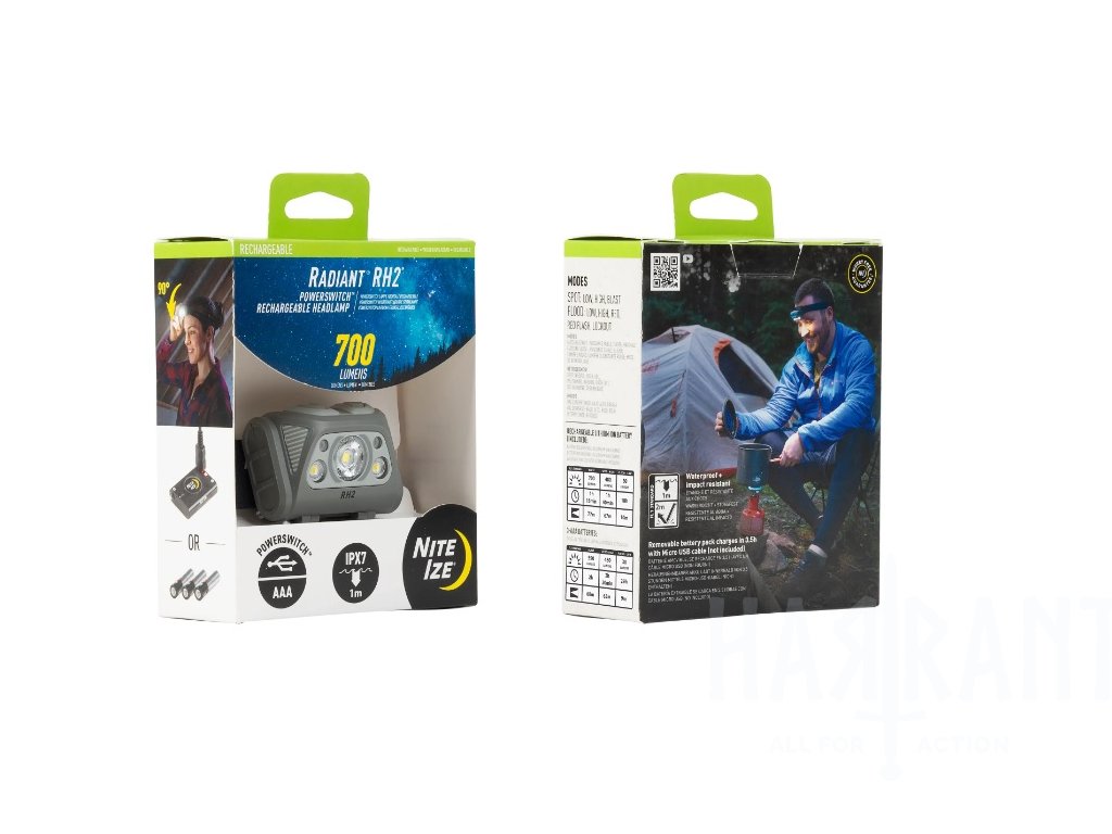 Čelovka RH2 je poháněna technologií PowerSwitch a funguje na dodávaný nabíjecí odnímatelný akumulátor nebo na 3 alkalické baterie AAA (nejsou součástí balení). Tělo čelovky je odolné proti povětrnostním vlivům a testované na pád z výšky až 2 metry, lze nastavovat v rozsahu 90° a vysílá paprsek na vzdálenost 77 metrů, přičemž při nízkém výkonu vydrží pracovat až 18 hodiny. Plně nastavitelný, pohodlný, odolný hlavový pásek zajistí, že i při dlouhém používání se budete cítit komfortně. Radiant® RH2™ PowerSwitch™ je vodoodpudivá dle standardu IPX7. Nabíjí se za 3,5 hodiny pomocí kabelu micro USB (není součástí balení) a je vybavena režimem uzamčení, který zabraňuje náhodnému vybití baterie.