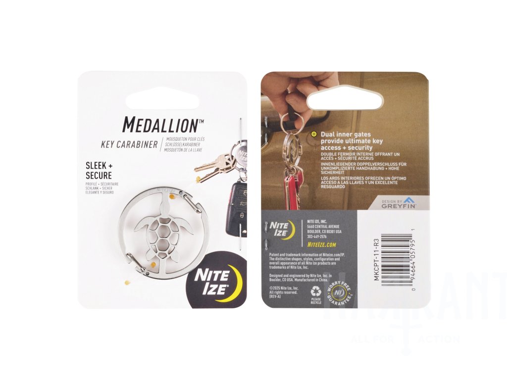 Klíčenka Nite Ize Medallion™ Turtle Key Carabiner přináší to nejlepší z obou světů a nabízí nejen eleganci, ale i užitečnost. Díky dvěma komorám v siluetě želvy můžete klíče jednoduše připnout a oddělit. Klíče jednoduše připnete a můžete je bez obav přenášet na dlouhé vzdálenosti, stejně snadno je odepnete pouhým stisknutím.