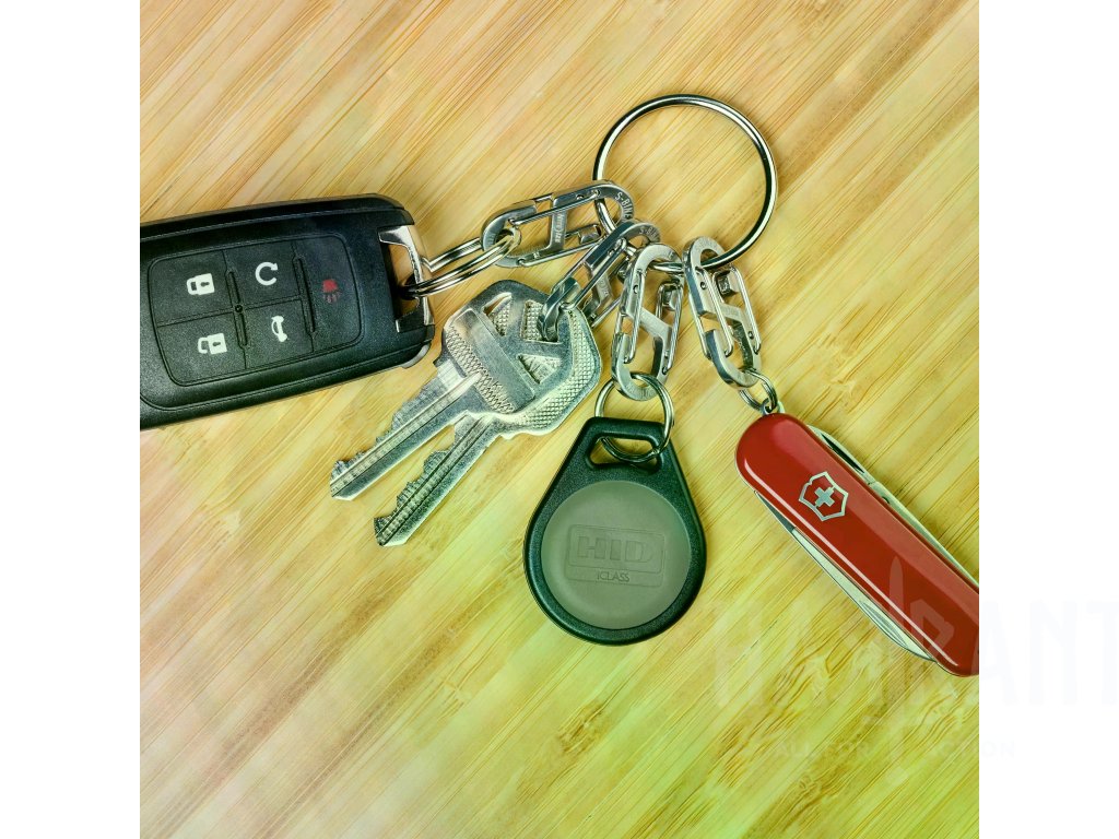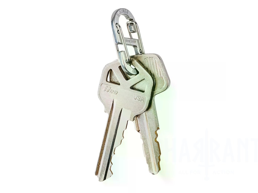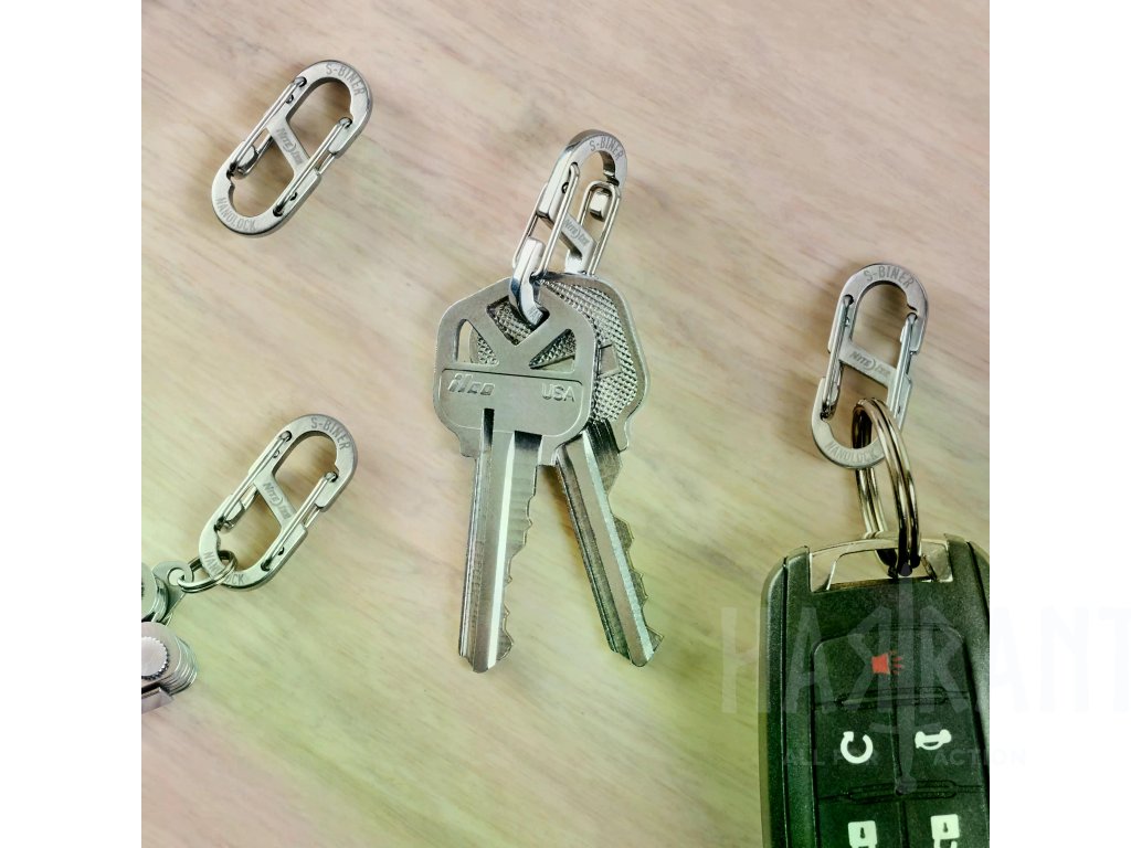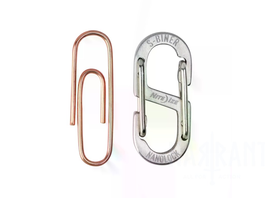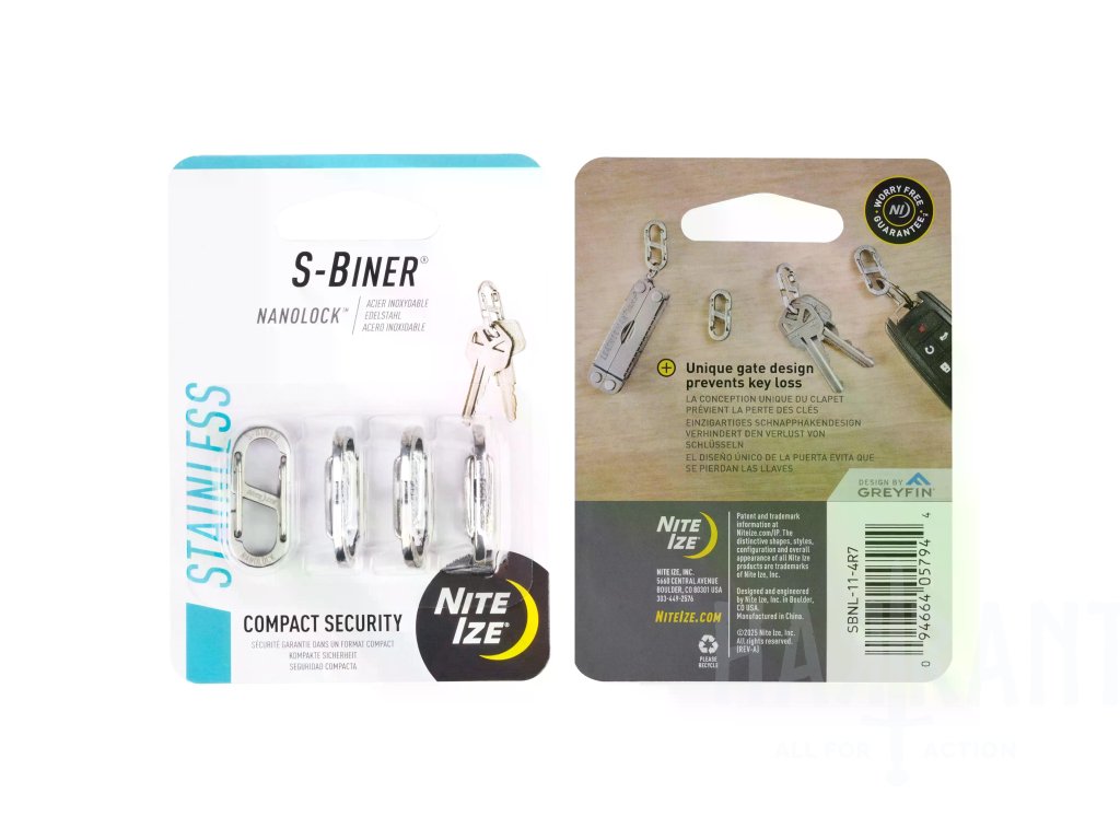 S-Biner NanoLock je miniaturní karabinek z nerezové oceli (rozměry přibližně 11,8 × 27,5 × 6,5 mm), navržený pro jednoduché připínání, nošení a rychlou výměnu klíčů a EDC doplňků. Užší otvor a speciální konstrukce branky zabraňují nechtěnému sklouznutí klíčů.