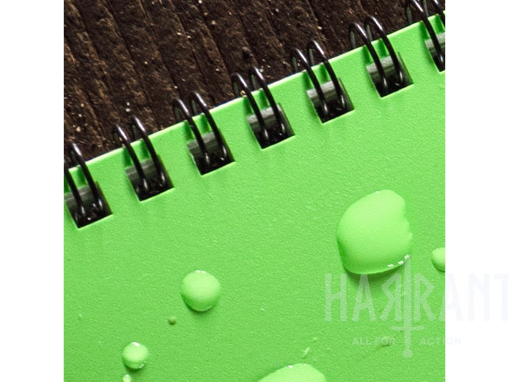 Desky z materiálu Polydura jsou pružné, pevné a chrání obsah před poškozením, skvrnami i poškrábáním. Výrazná Hi-Vis zelená barva zajišťuje, že zápisník vždy rychle najdete, i v náročných podmínkách.
