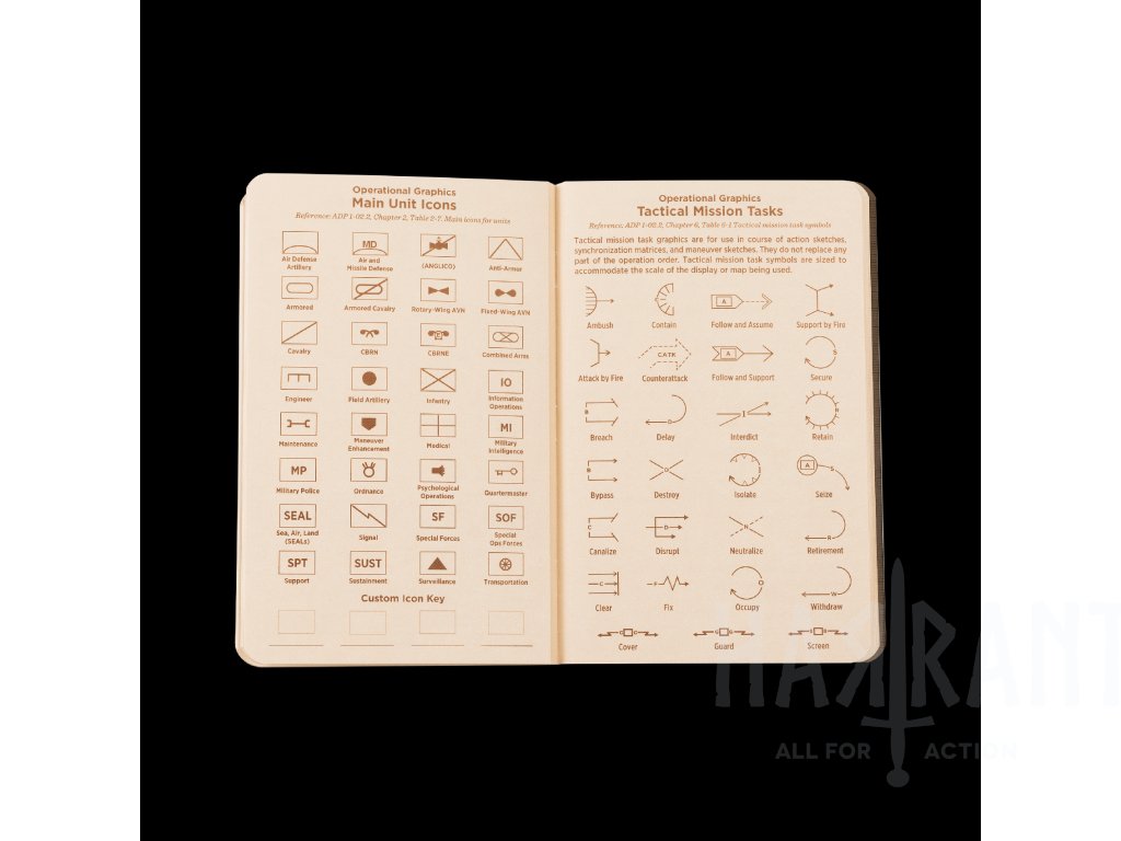 Každý zápisník obsahuje 16 stran taktických šablon, formulářů a měřítek – například 9-line reporty, CAS brief nebo konverzní tabulky. Čitelné na matném tan papíru, vhodné pro použití v terénu. Hnědý tisk Universal rastru je ideální pro zápisky, náčrty, mapové poznámky nebo plánování. Neleskne se a neoslňuje ani při použití čelovky. Obálka Field-Flex. Odolná, pružná a snadno omyvatelná. Přizpůsobí se kapse nebo pouzdru, nepoláme se a chrání listy i v náročných podmínkách. Vazba z niklovaných spon. Niklované sponky odolné proti korozi drží sešit pevně a dovolují jeho úplné rozevření „na placku“. Ideální pro psaní na mapě, stole nebo na koleni.