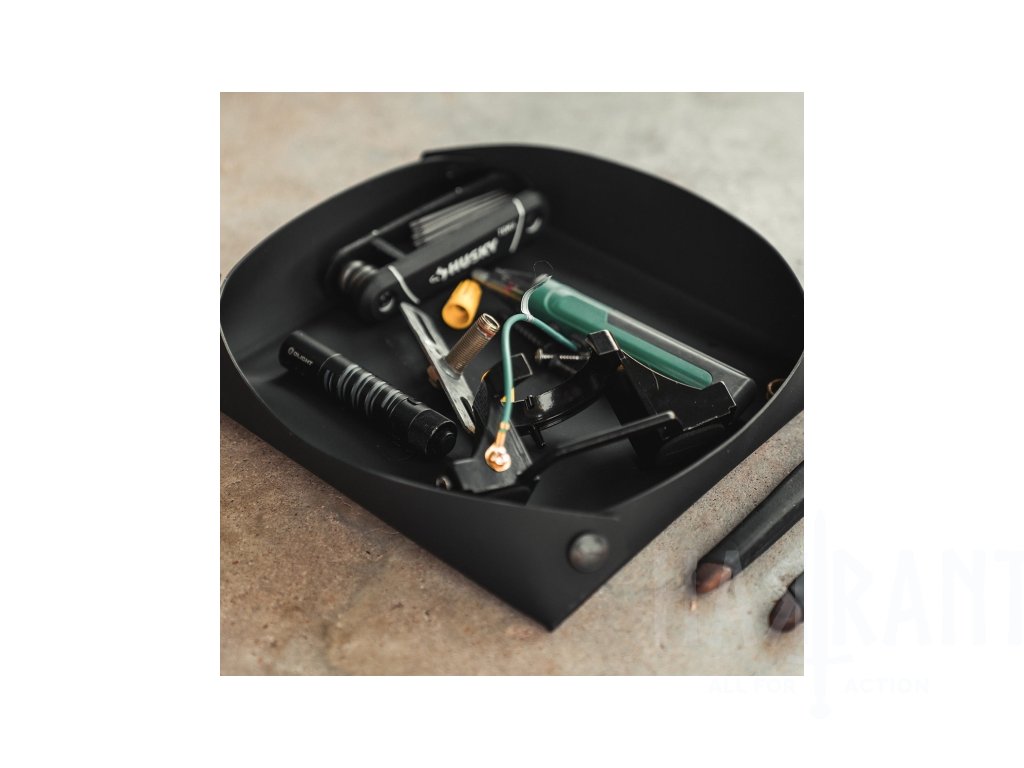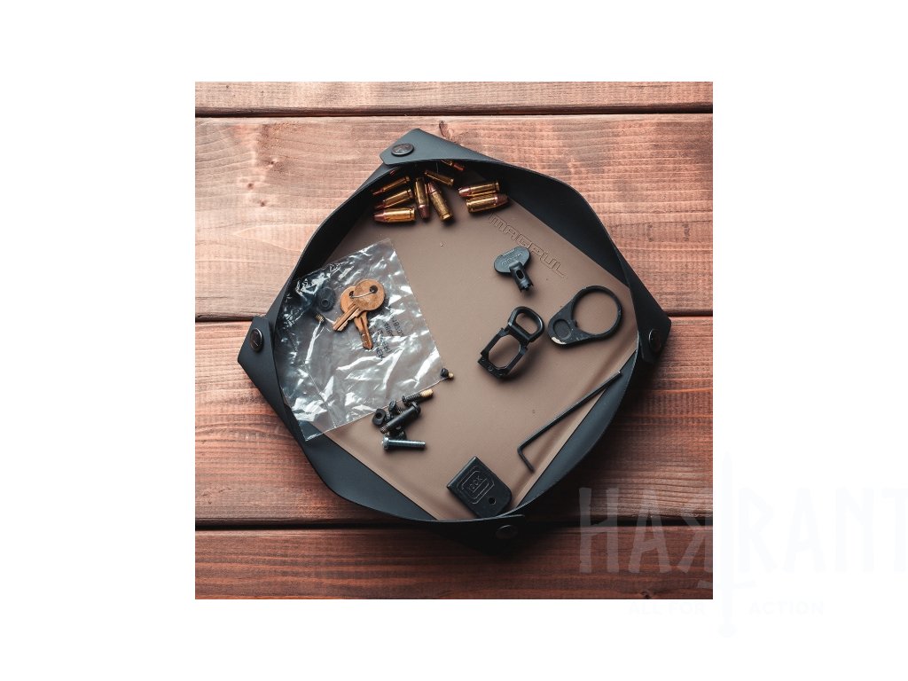 Odkládací podložka Field Tray je vyrobena z našeho odolného materiálu DAKA a vyznačují se odolností, pružností a pevností, které vydrží i ty nejextrémnější podmínky. Jednoduchým zacvaknutím čtyř rohů vytvoříte z odkládací podložky zábrany, které uzavřou pracovní prostor a udrží vaše předměty v jednom uzavřeném prostoru. Silný magnet umístěný pod ikonou Magpul zadrží drobné kovové předměty a zajistí, že neztratíte nic důležitého pro daný okamžik. Vnitřní strana podložky odvádí nečistoty. Když se podložka Field Tray nepoužívá, lze ji rozložit a uložit kamkoliv. Je ideální do kufrů na zbraně, batohů a brašen na střelnici.