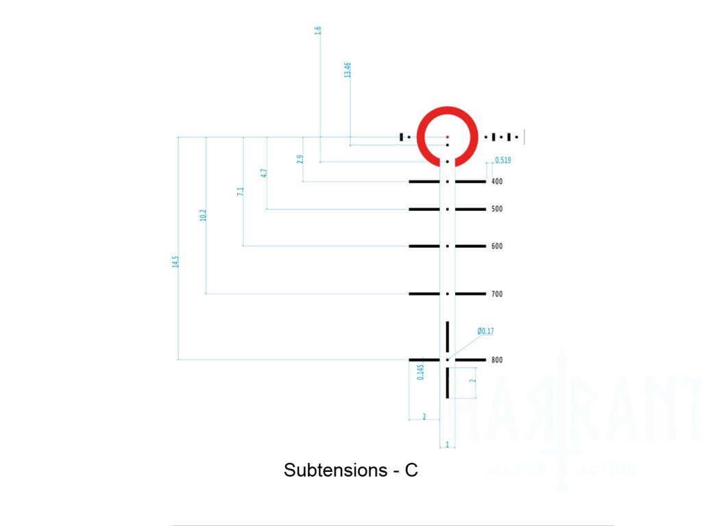 - Zaměřovací kříž může být osvětlen červeně pomocí 8 úrovní jasu. Věže pro nastavení klikání MRAD o rozměrech 1 cm x 100 m jsou chráněny pevnými šroubovacími uzávěry.