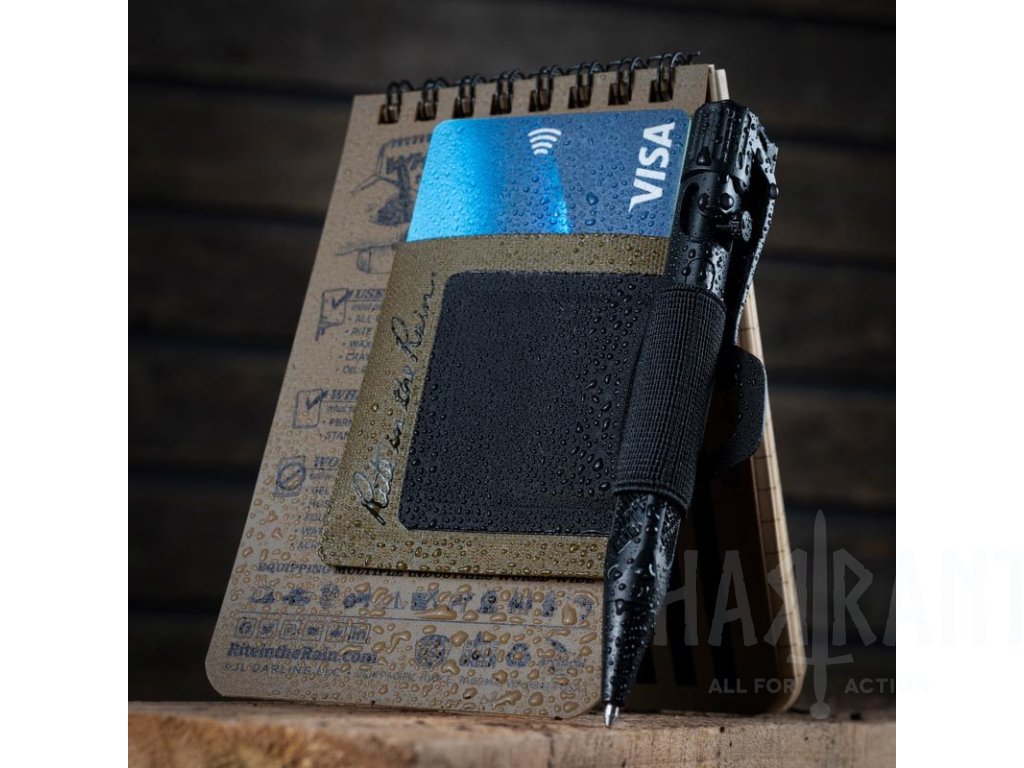 Monsoon Pen Holster je vybaven vodotěsnou přední částí z odolného TPU a silnou samolepicí zadní stranou, díky které jej snadno připevníte na jakýkoliv zápisník. Součástí sady je mini bolt-action pero Rite in the Rain No. 20K s tlakovou náplní a oblíbený top-spiral zápisník No. 735 ve formátu 3 × 5 palců (cca 76 × 127 mm).