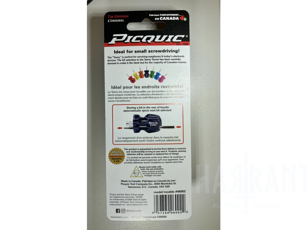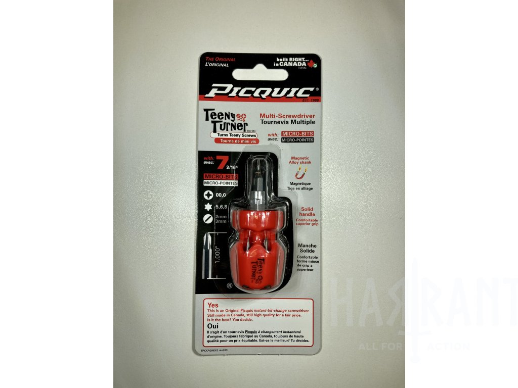 Mini - šroubovák Picquic Teeny Turner je navržen pro drobné úkoly a každodenní nošení. Tento model šroubováku Picquic má nejmenší nabízenou rukojeť a přitom je stále dobře ovladatelný. Šroubovák je vybaven šestihrannými bity - ideálními pro údržbu brýlí, šperků, nebo drobné elektroniky. Tenké šestihranné mikro bity 3/16" o délce 2,5 cm / 1"jsou vyrobeny z vysoce kvalitních materiálů, jsou přesně opracované a odborně kalené. Díky tomu sedí velice přesně do hlavic šroubků a odolávají i intenzivnímu používání. Vyrobeno v Kanadě!