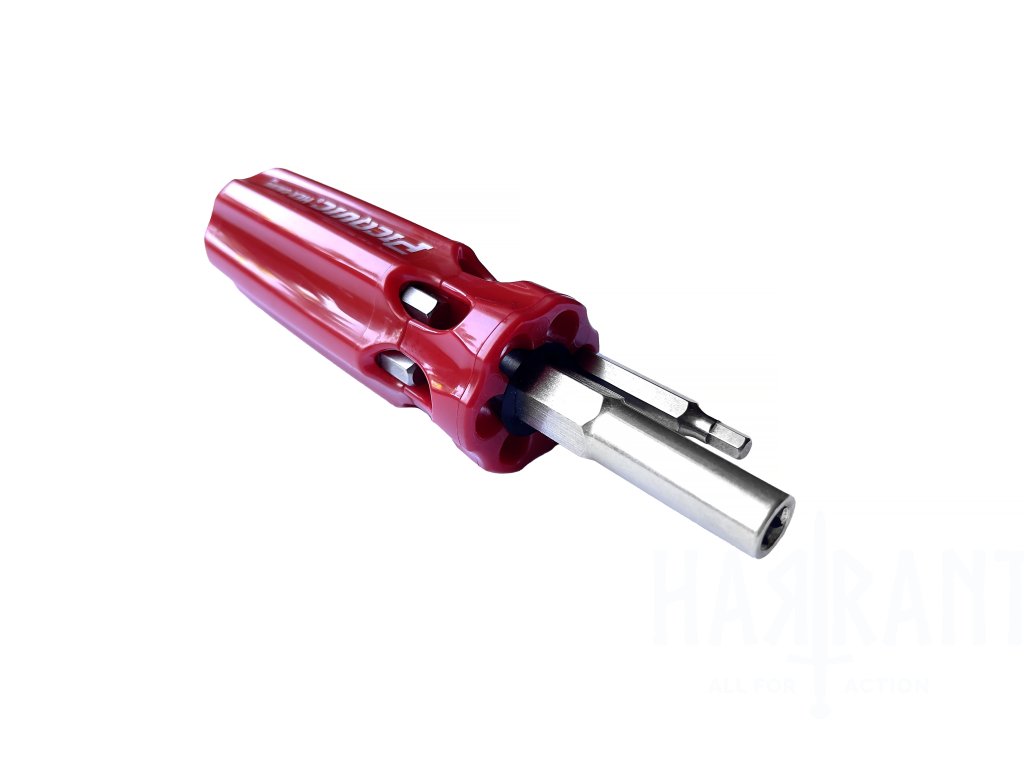 HEX-CALIBRE je vybaven pevnou rukojetí, která nabízí pohodlný úchop a umožňuje dosáhnout maximálního krouticího momentu. Tato šroubováková sada je konstruována bez pohyblivých částí, které by mohly být náchylné k zlomení nebo ztrátě. Dřík šroubováku, vyrobený z letecké slitiny, poskytuje zesílený šestihranný tvar, který je přímo určen pro použití s očkoplochým klíčem velikosti 11 (7/16"). Tato kombinace zvládne i nejtěžší utažené šrouby. Dřík je navíc vybaven magnetem ze vzácných zemin, který pevně drží pracovní bity v šachtě bez ohledu na pracovní polohu nebo otřesy. Magnety ze vzácných zemin (rare earth magnets) se vyznačují maximální přídržnou silou. Celá sada šroubováku je navržena tak, aby odolala i nejnáročnějším podmínkám. Rukojeť šroubováku slouží také jako zásobník na další bity, z nichž je v sadě celkem sedm. Výměna bitů je snadná - stačí vyjmout bit z dříku a zasunout další vybraný bit ze spodní strany rukojeti. Společnost Picquic byla průkopníkem v systému revolverově uložených náhradních bitů. Díky patentované technologii bity z rukojeti nevypadnou ani při maximálním úsilí.