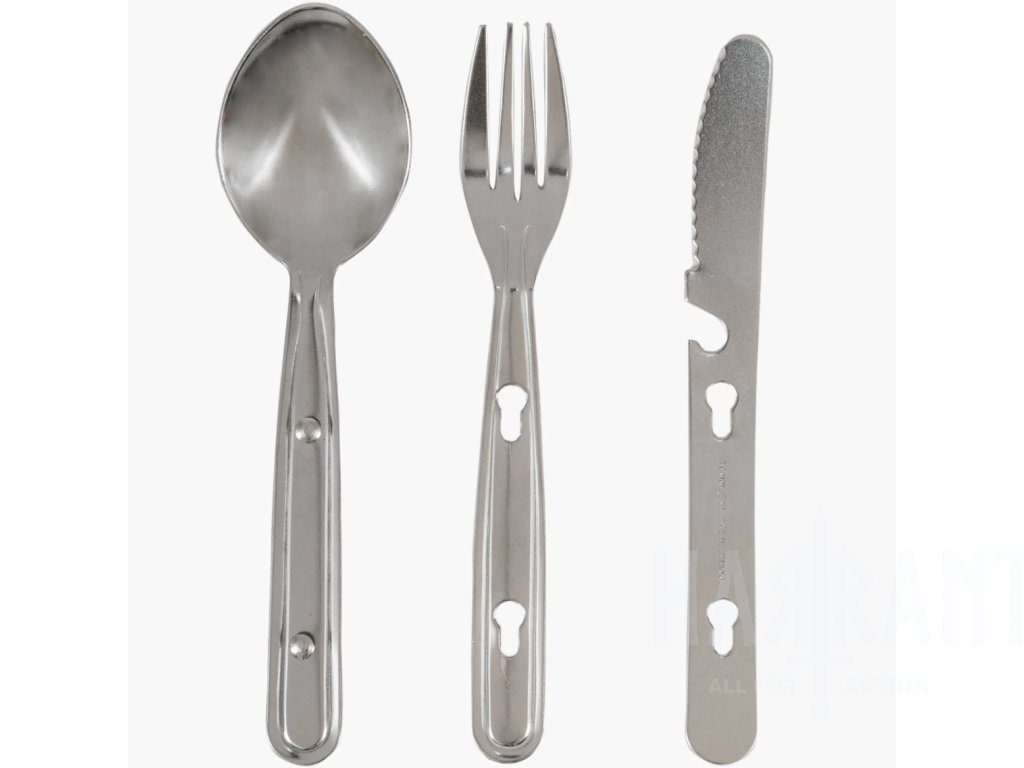 Highlander outdoor příbor s klipem – Knife Fork Spoon Clip Set 3 díly • nerezová ocel • otvírák lahví