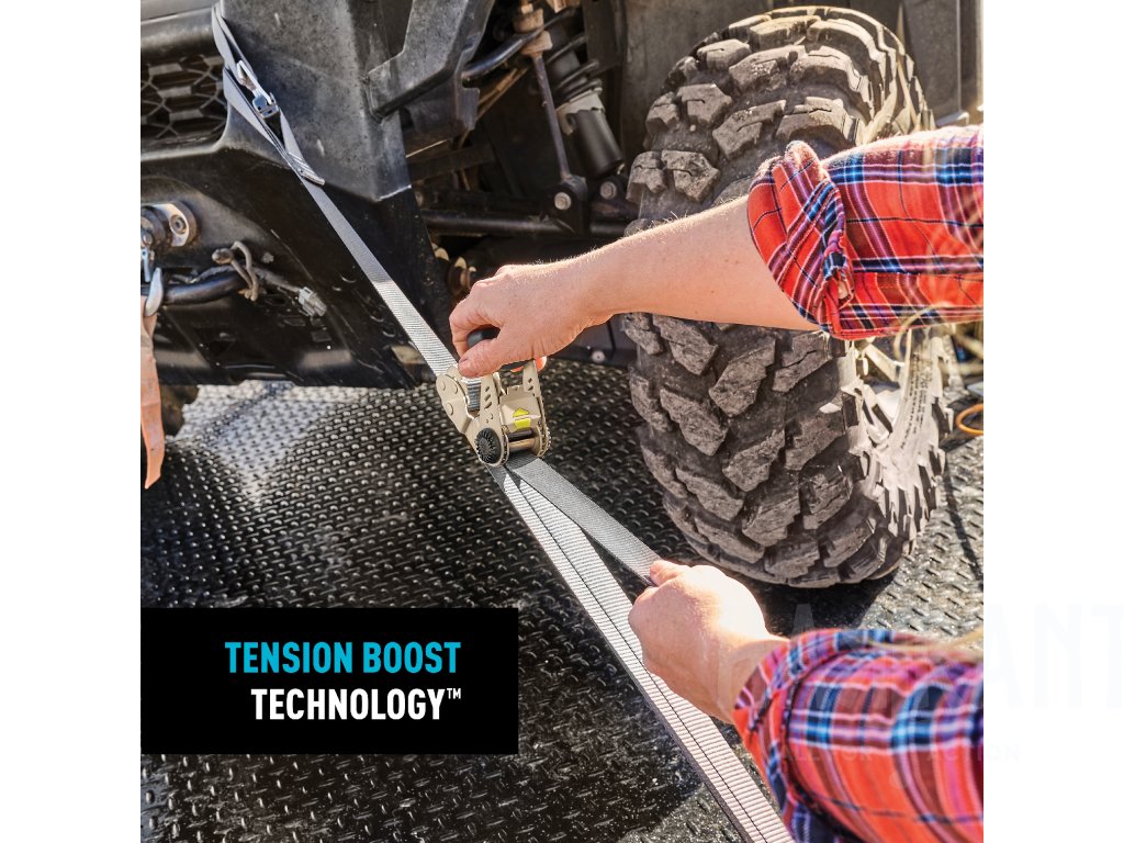 Když nastane čas na napnutí, inovativní konstrukce cívky umožňuje jednoduše otáčet a zavádět konec popruhu do spony. Patentovaná technologie Tension Boost Technology™ snižuje námahu při ráčnování na polovinu a téměř zdvojnásobuje napětí v popruhu, čímž zajišťuje hladký chod a dlouhou životnost.
