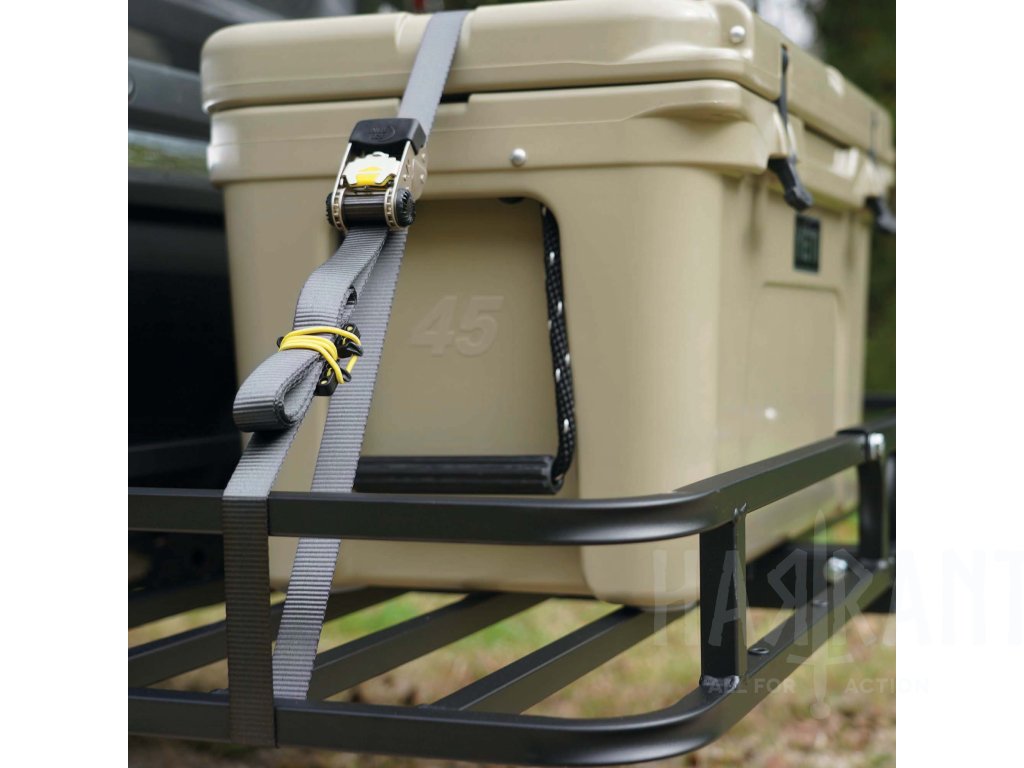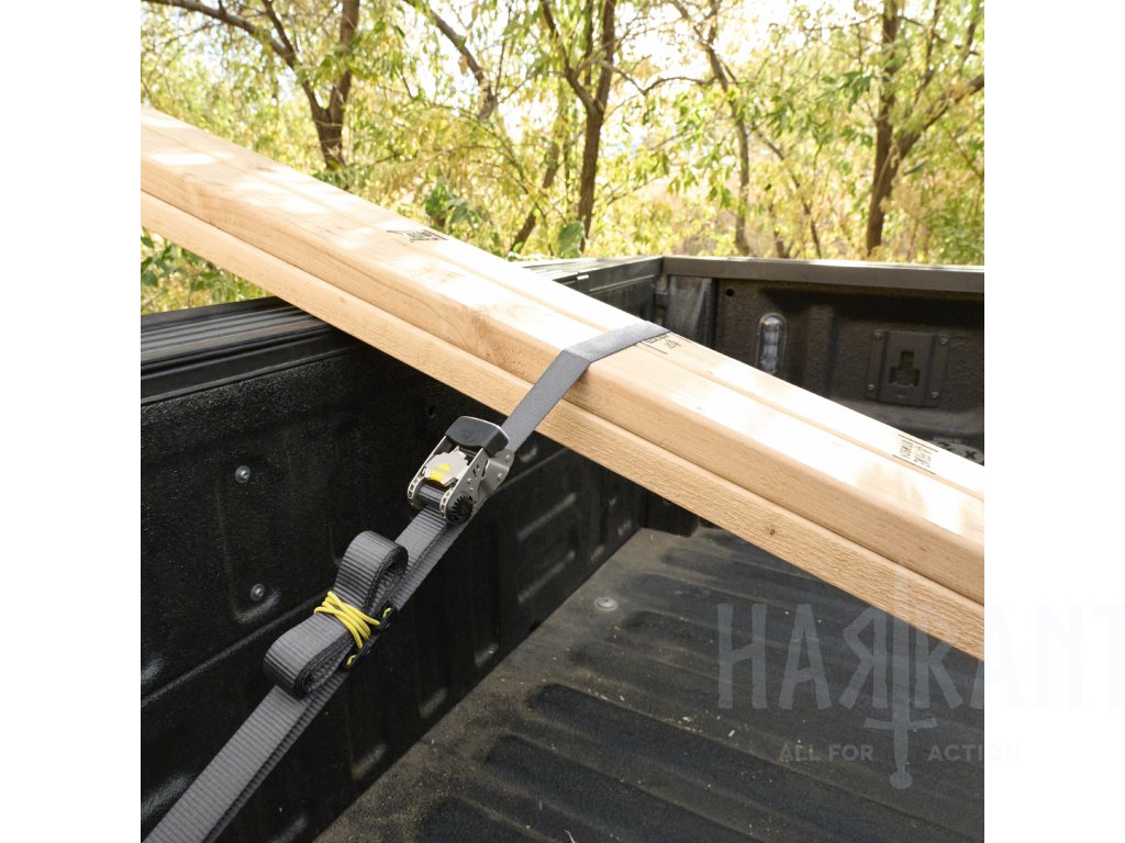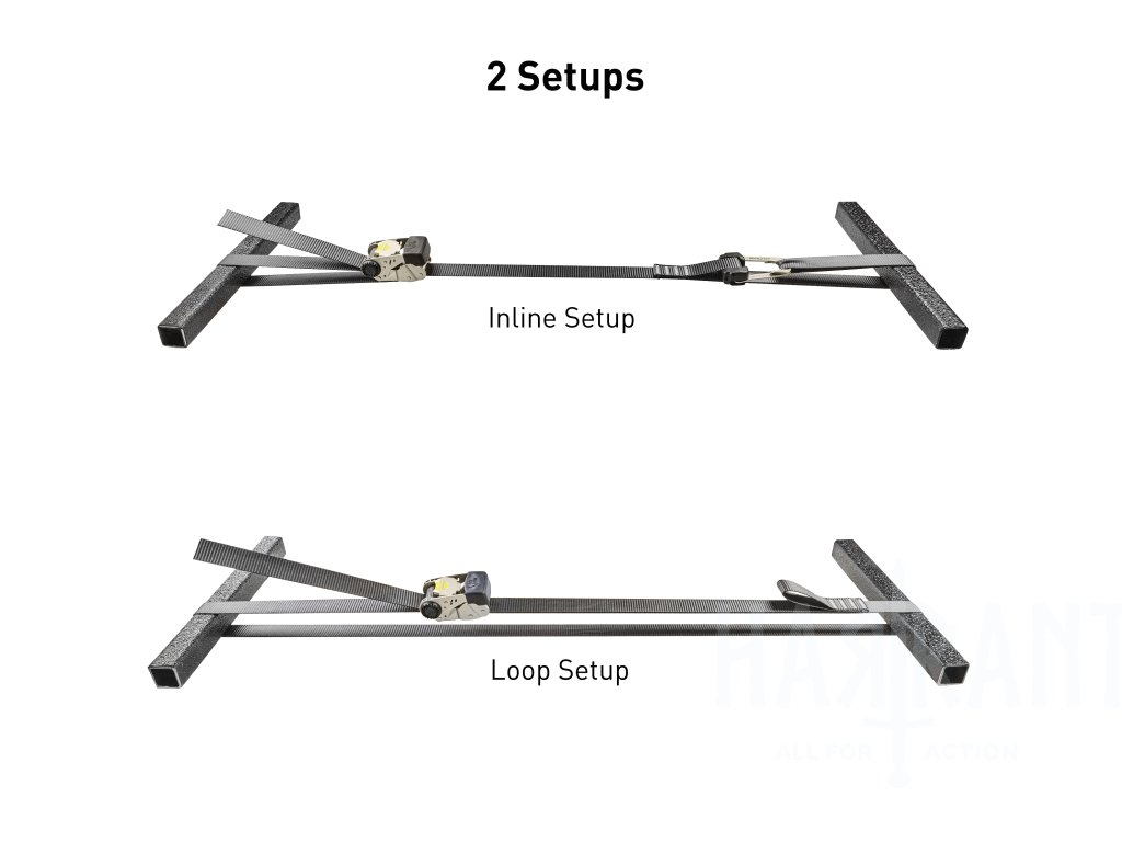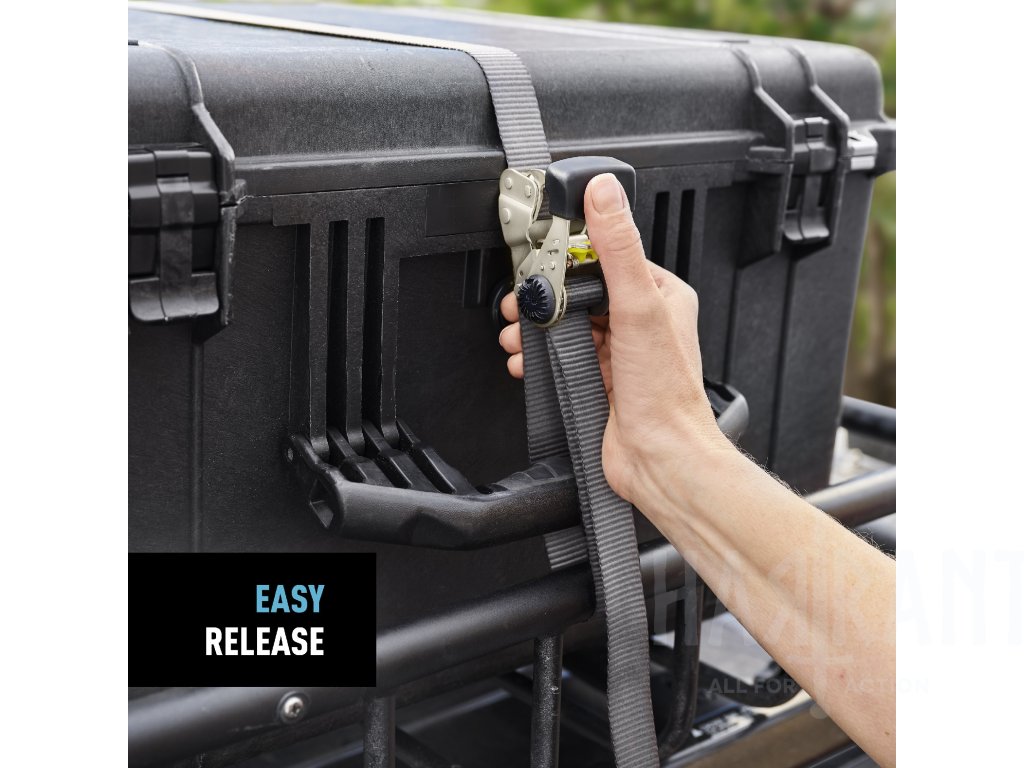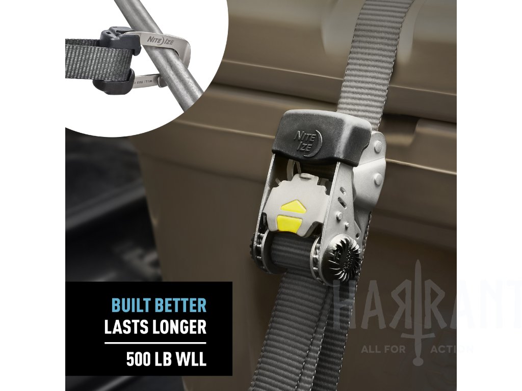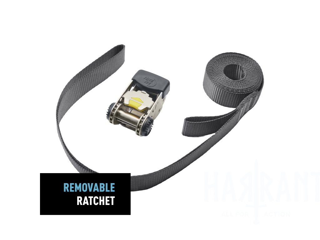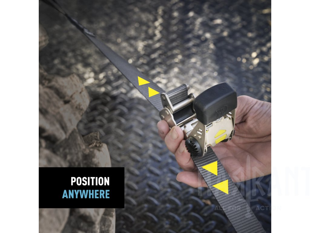 Systém obsahuje první odnímatelnou a nastavitelnou ráčnu, která umožňuje její umístění kdekoliv na popruhu pro snadný přístup a větší flexibilitu při upevňování středně těžkých nákladů (pracovní zatížení až 500 liber / cca 227 kg).