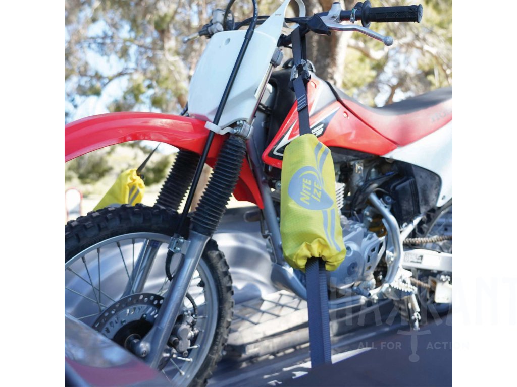 Po použití můžete celý systém uložit do 2 přiložených reflexních úložných vaků pro snadnou organizaci – nebo jeden vak během jízdy připevnit kolem spony a volného popruhu, čímž zabráníte plápolání a ochráníte sponu před větrem a nečistotami při delších převozech.